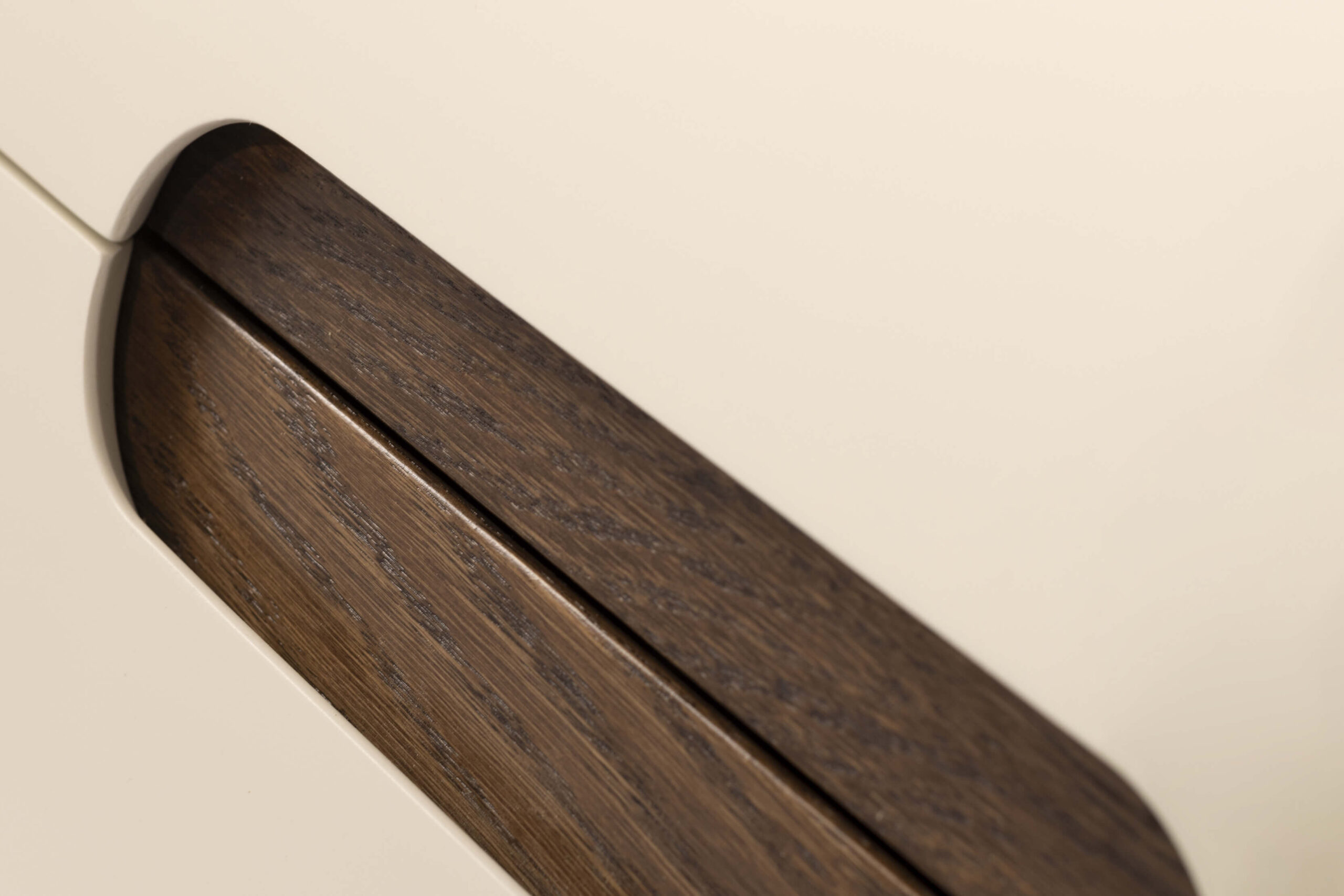 This bedside table is made of a combination of refined chipboard, MDF and solid wood. The sides are made of white melamine chipboard treated with PU varnish, in the tone of Bianco pearl. The panel and doors on the drawers are made of MDF in the same tone. Instead of handles, Alora has an interesting design solution for opening and closing drawers, made of veneered MDF in dark walnut color. The frame and legs of the stand are made of solid beech, in the tone of dark walnut.