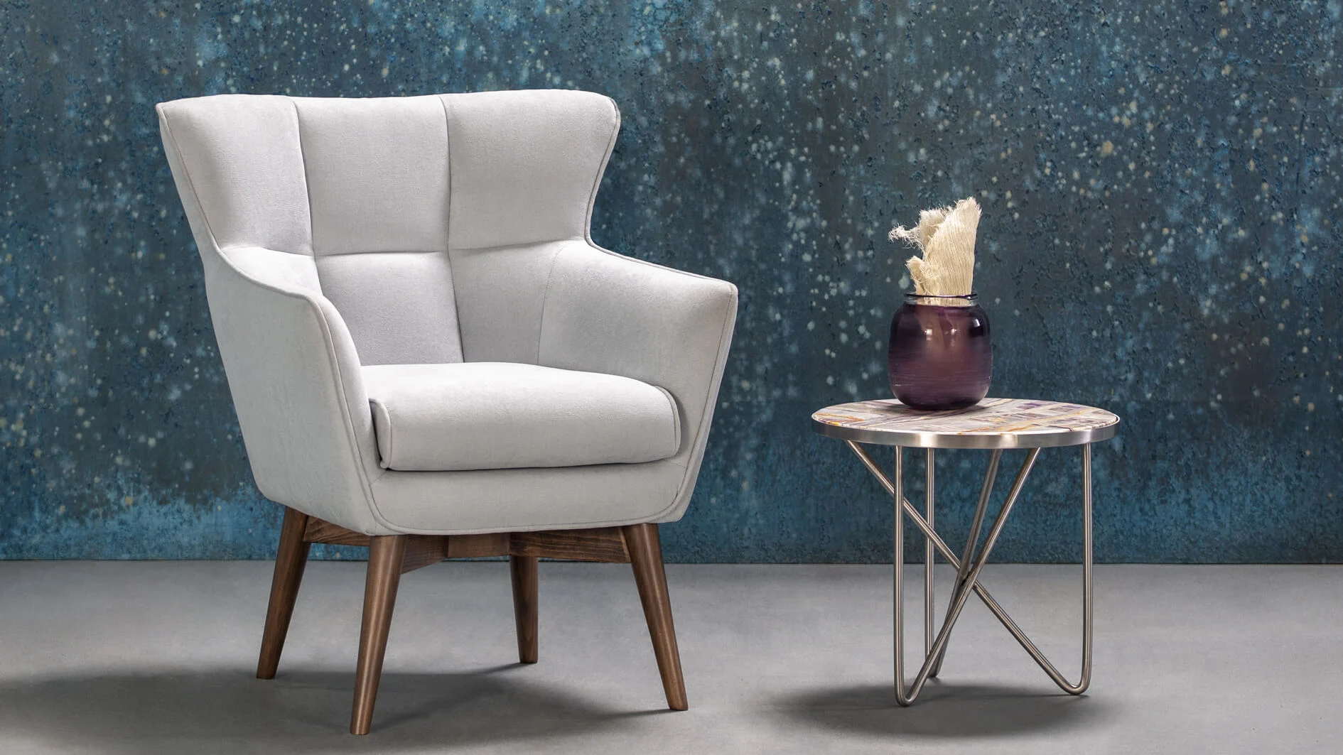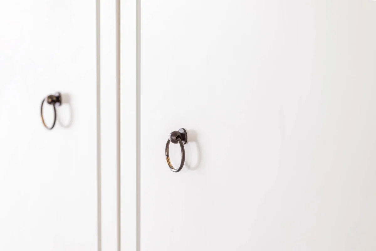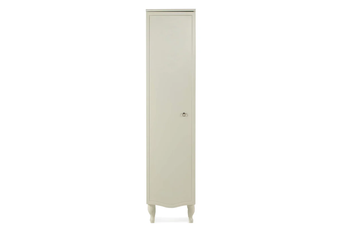Glorija wardrobe has a construction made of melamine chipboard and MDF, with fronts made of MDF. The finish is in ivory color. The legs are made of solid beech wood. There are bronze handles in the shape of small rings on the wardrobe door.