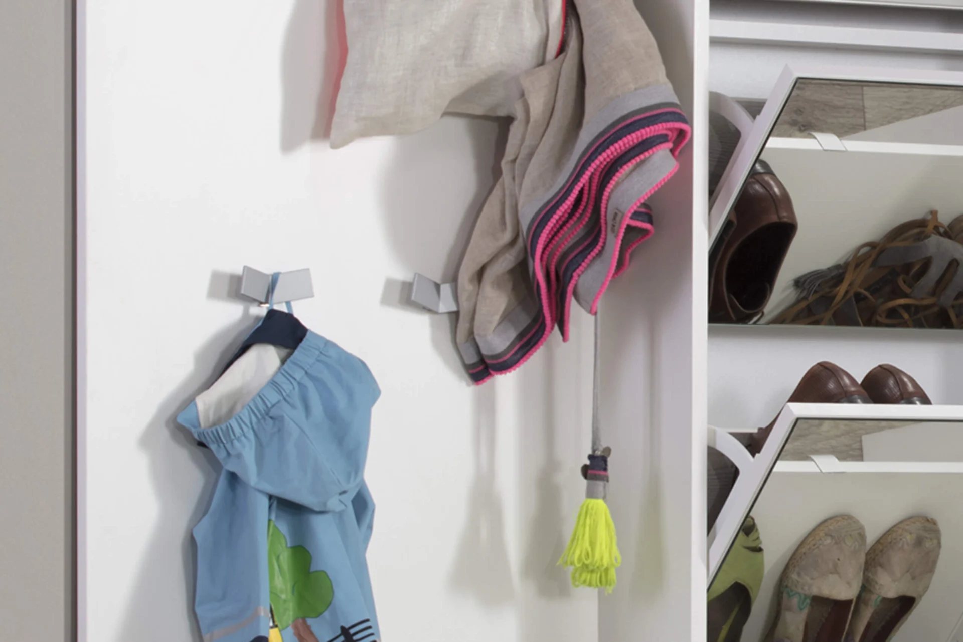 You can hang a lot of clothes on five double-sided metal hangers. Three larger metal hangers are placed on the upper level and are more suitable for adults. On the lower level, there are two smaller metal hangers, more accessible to children. In that way, each of the household members will have a practical overview of the clothes that will be at their fingertips.