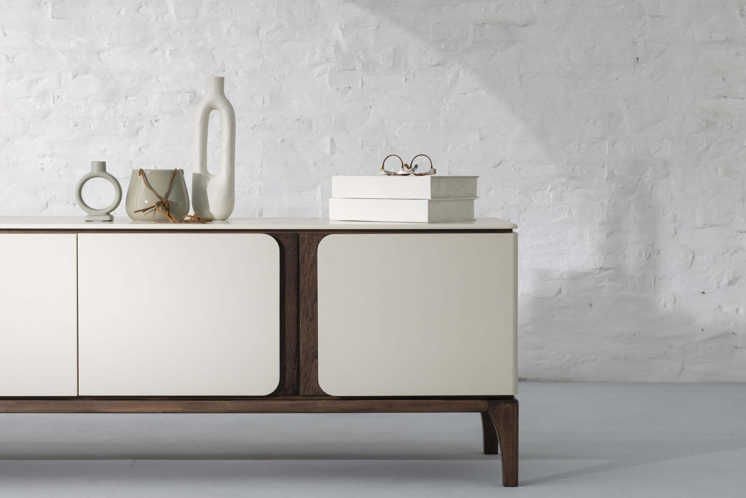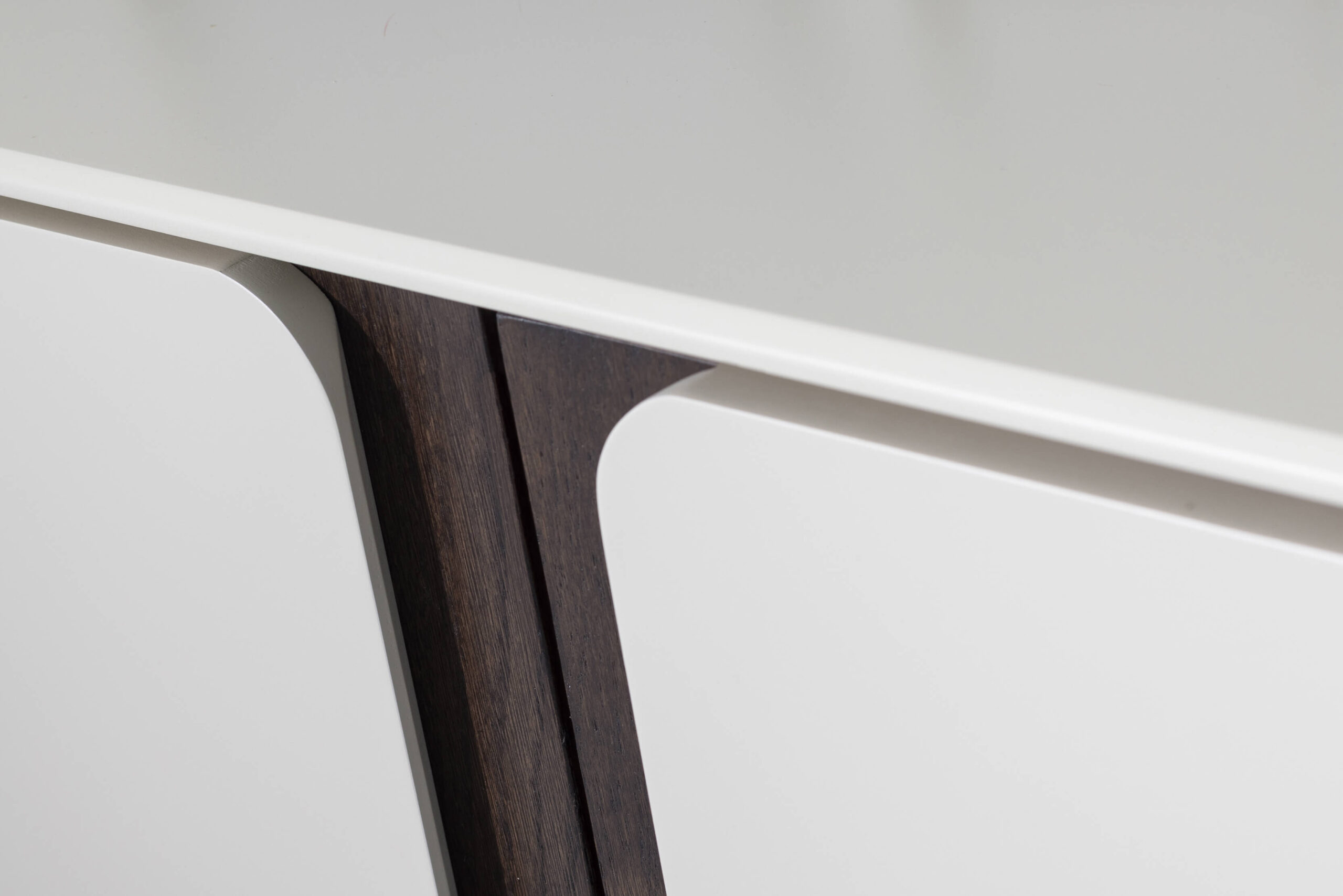 An interesting combination of melamine chipboard, MDF and solid wood in contrasting tones of dark walnut and Bianco pearl tone, creates a modern look suitable for different furnishing styles.