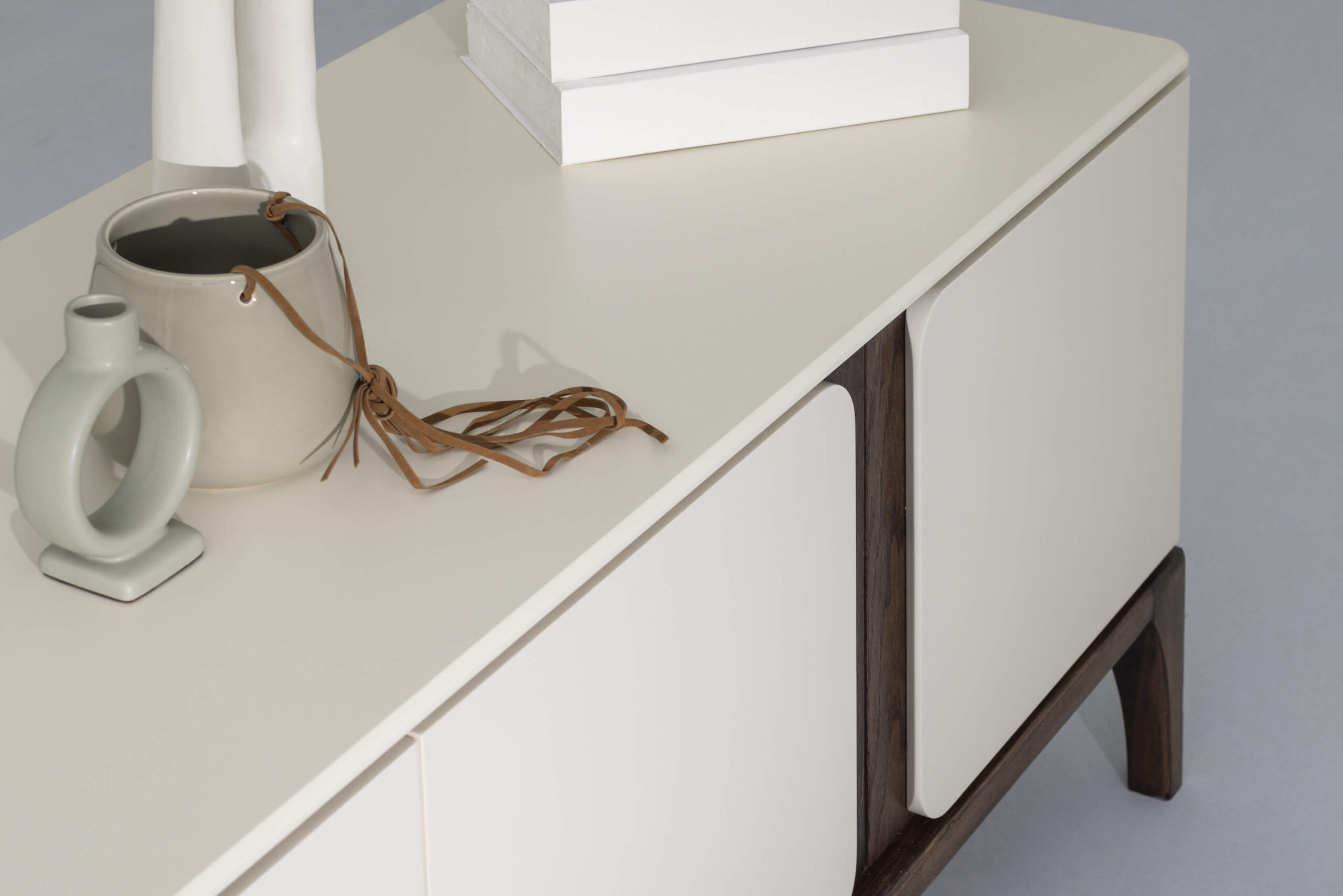 The sides of this TV set are made of white melamine chipboard and finished with PU varnish, in the tone of Bianco pearl. The panel and door fronts are made of MDF in the same tone. Instead of handles, Alora has an interesting design solution for opening and closing the door on the dresser, made of veneered MDF in dark walnut color. The frame and legs of the stand are made of solid beech, also in dark walnut.