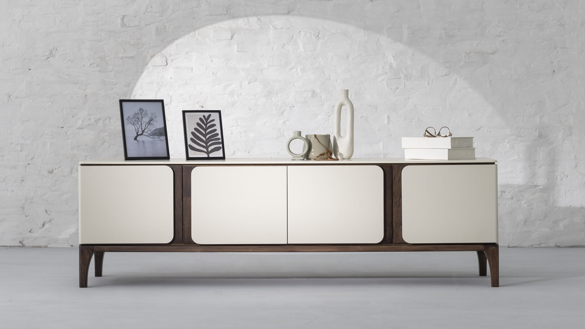 The Alora set with four doors and eight internal segments offers enough space for neatly storing various things. The versatility of the TV set is reflected in the fact that the top plate can be used for your TV set and audio-visual equipment, and if you place the TV set on the wall, you will get a perfect place for family photos and favorite decorative items.
