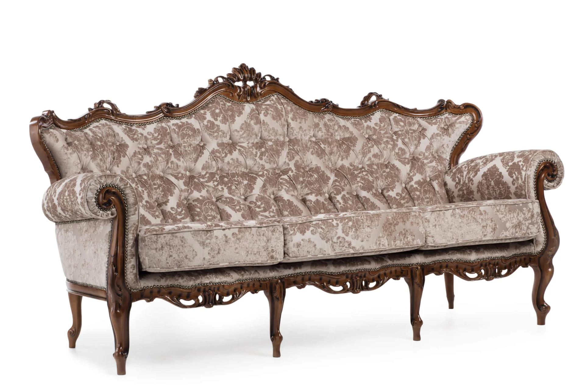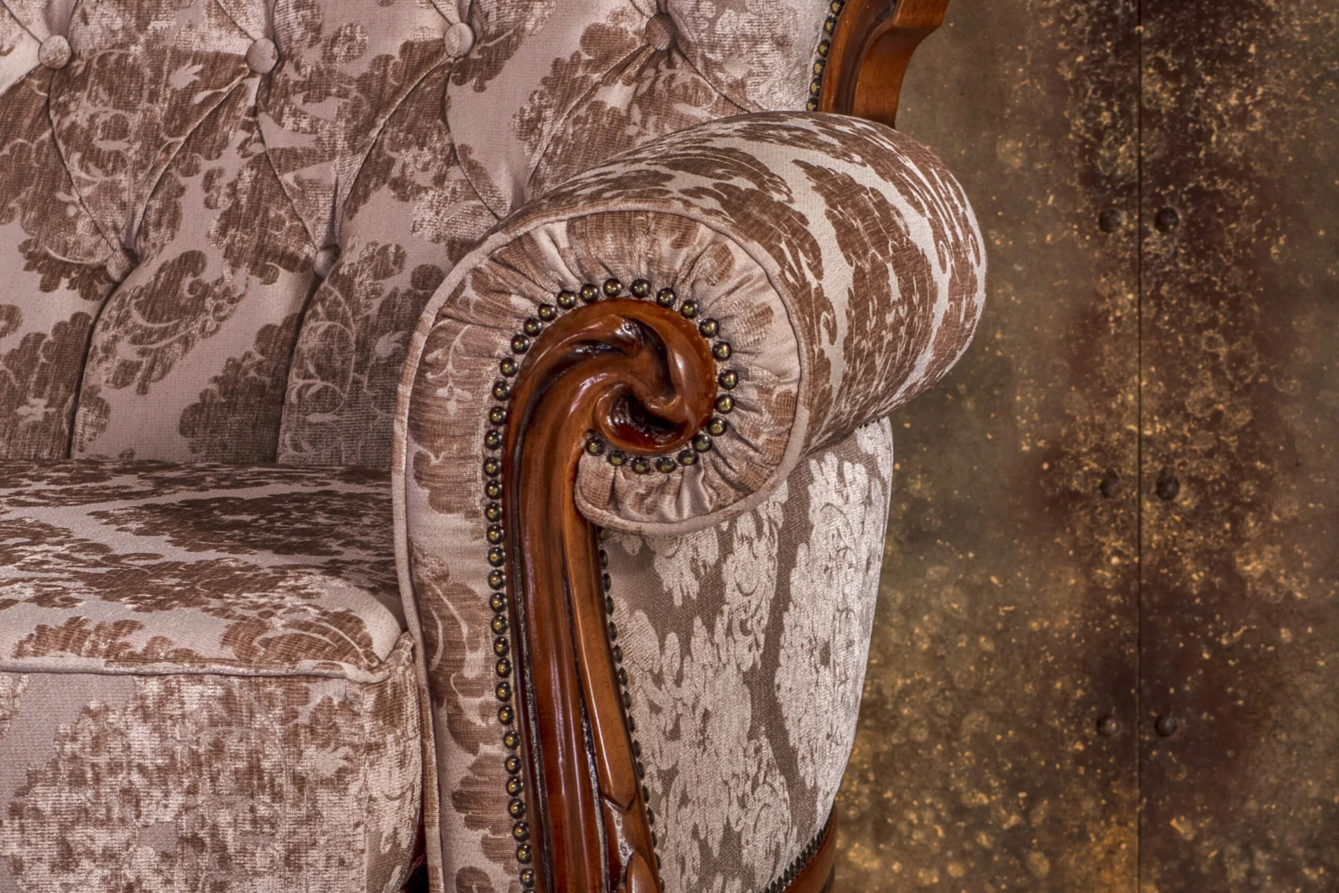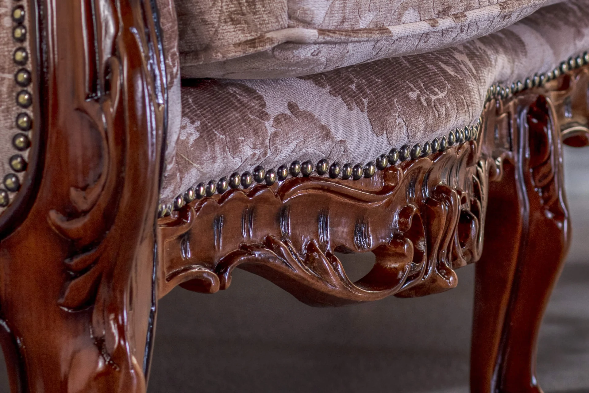 Mnogo je autentičnih detalja na ovom modelu, od dekorativnih rezbarenih elemenata na drvenom ramu, valovitih nogu, zaobljenih rukonaslona do ukrasnih nitni i dekorativnih dugmadi. Kroz harmoniju oblika i materijala, sve odiše posebnim stilskim izrazom. Raskošan izgled prati užitak u udobnosti.