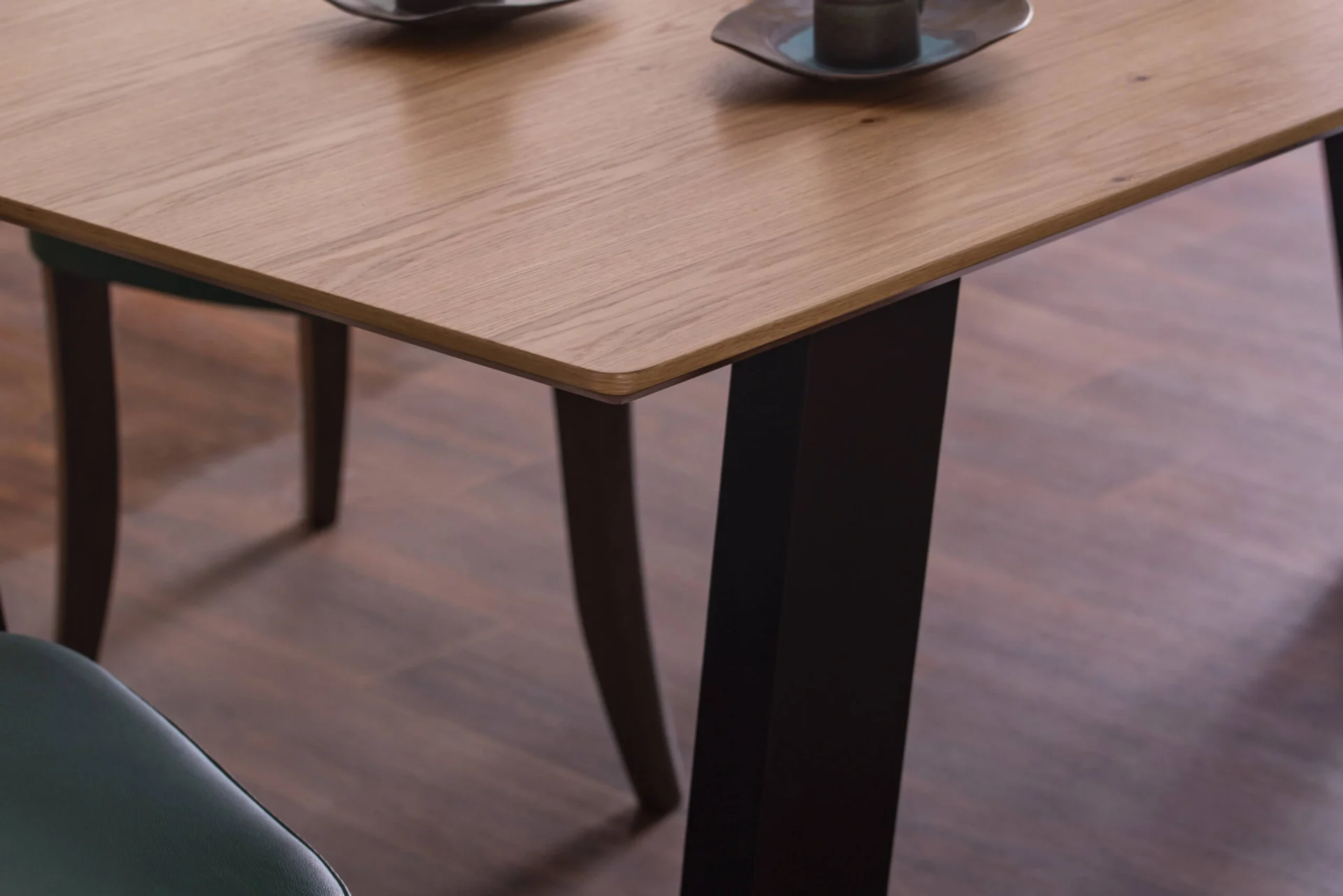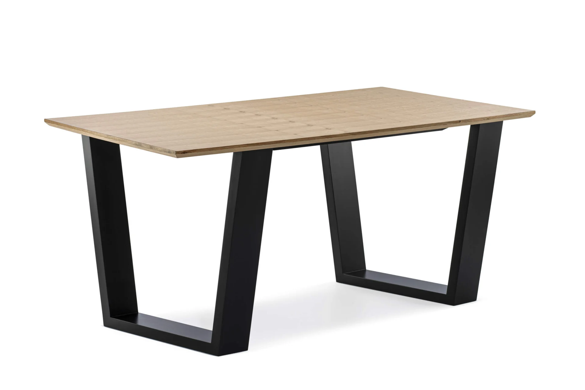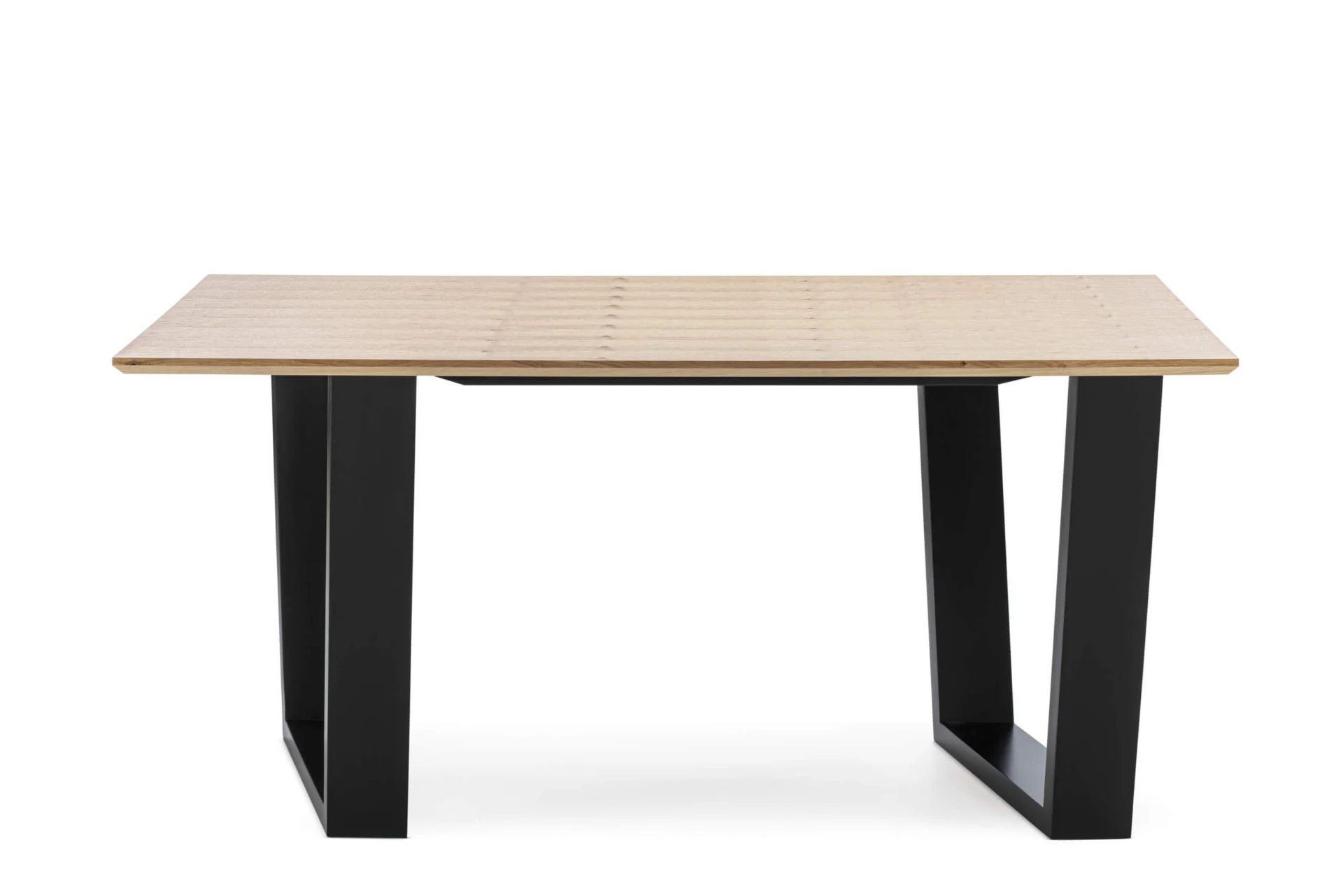 Sigurno će vas prvo privući bogata tekstura drveta na pravougaonoj ploči stola, napravljenoj od medijapana u furnituru hrasta u natur tonu. Pored karakteristične površine stola, originalnom dizajnu doprinose i noge neobične forme u crnoj boji napravljene od bukovog masiva. Za čvrstoću i stabilnost ovog trpezarijskog stola zaslužna je jaka metalna podkonstrukcija.